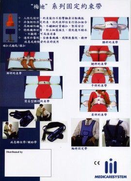 1. 磁扣式鎖扣約束裝置、.三層式設計、底部固定於床梁,上部固定於胸、肩部並附間隔固定孔,可適用於不同胸、肩圍尺寸之約束,安全性佳